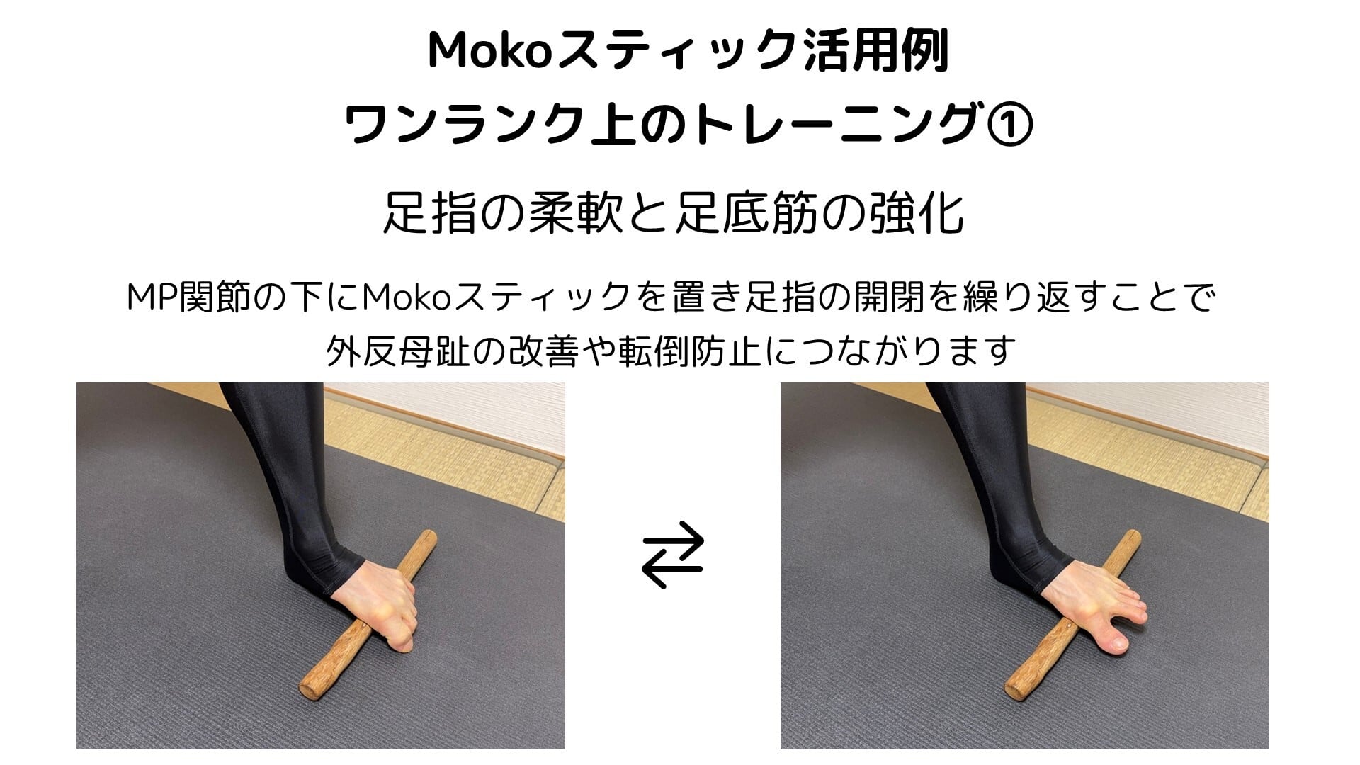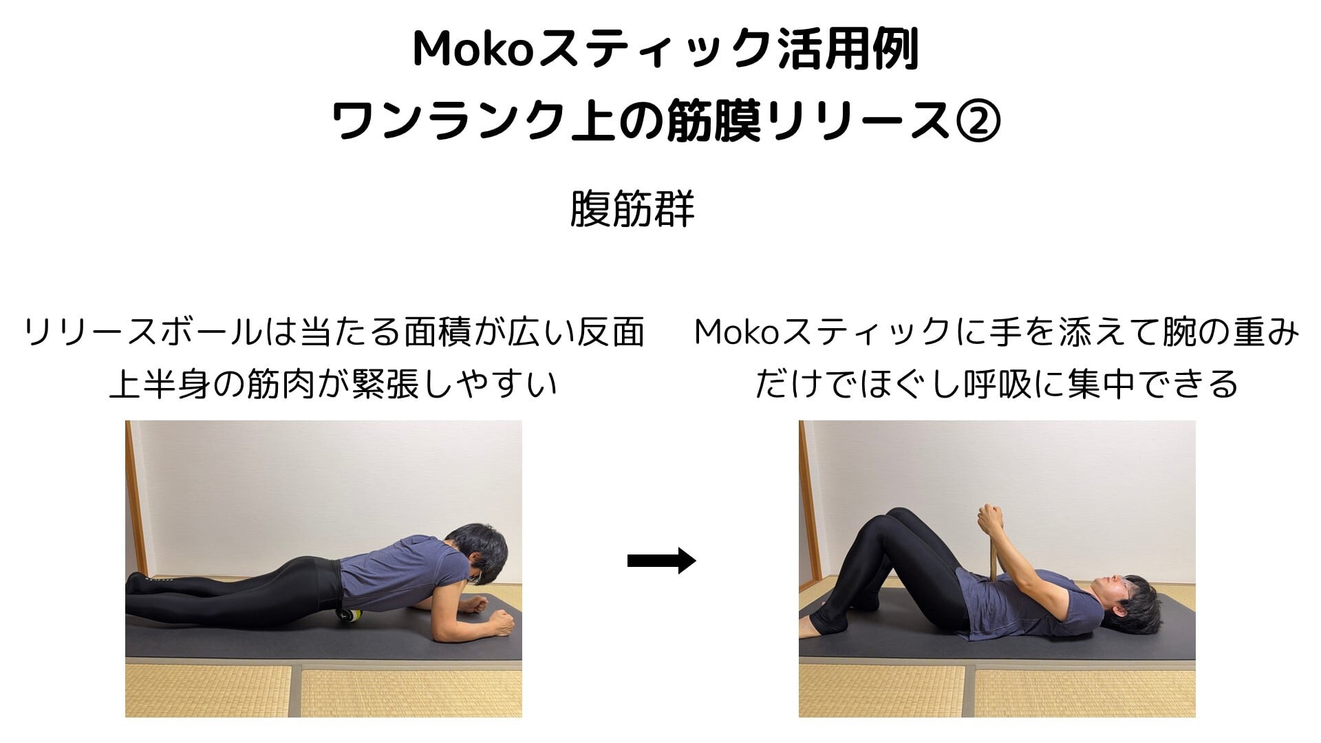 市販されている筋膜リリースのアイテムが痛い場合、Mokoスティックを握って呼吸を促して筋肉を緩める感覚に集中してみてください。