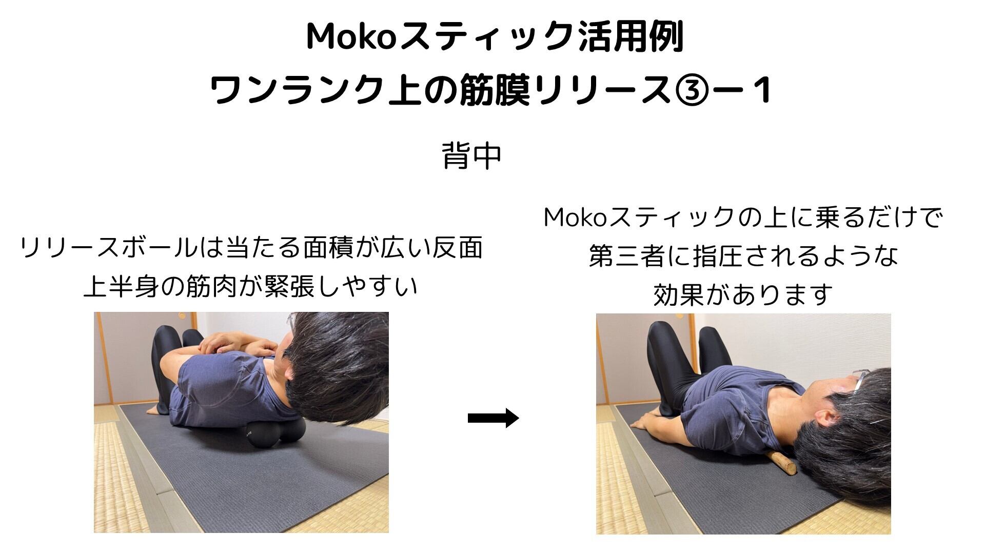 市販されている筋膜リリースのアイテムが痛い場合、Mokoスティックを握って呼吸を促して筋肉を緩める感覚に集中してみてください。