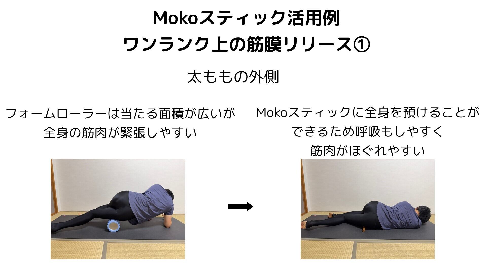 市販されている筋膜リリースのアイテムが痛い場合、Mokoスティックを握って呼吸を促して筋肉を緩める感覚に集中してみてください。